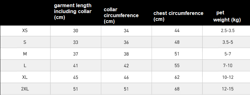 Pet size chart: